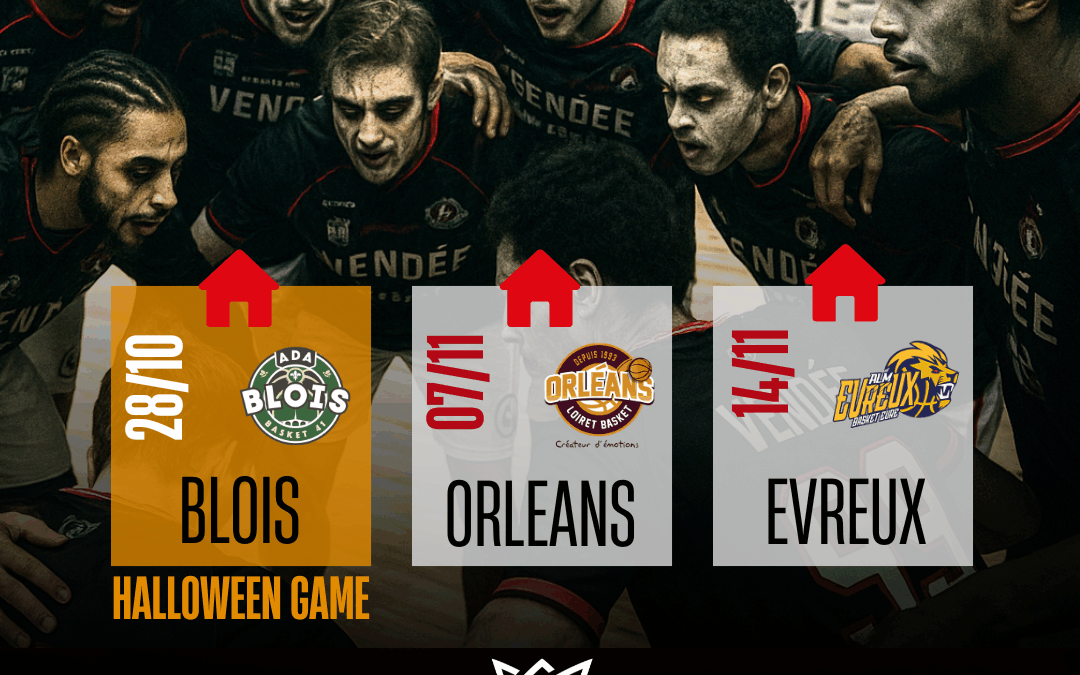 La salle Michel Vrignaud s’apprête à vivre un mois de novembre sous haute tension avec trois rendez-vous à ne pas manquer. Nos joueurs comptent plus que jamais sur votre soutien pour enflammer les tribunes et faire vibrer Challans ! 🎉